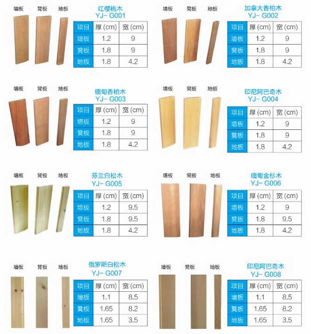 材質很多如:紅櫻桃木、加拿大柏木、緬甸香柏木、印尼阿巴奇木、芬蘭白松木、緬甸金杉木、俄羅斯白松木