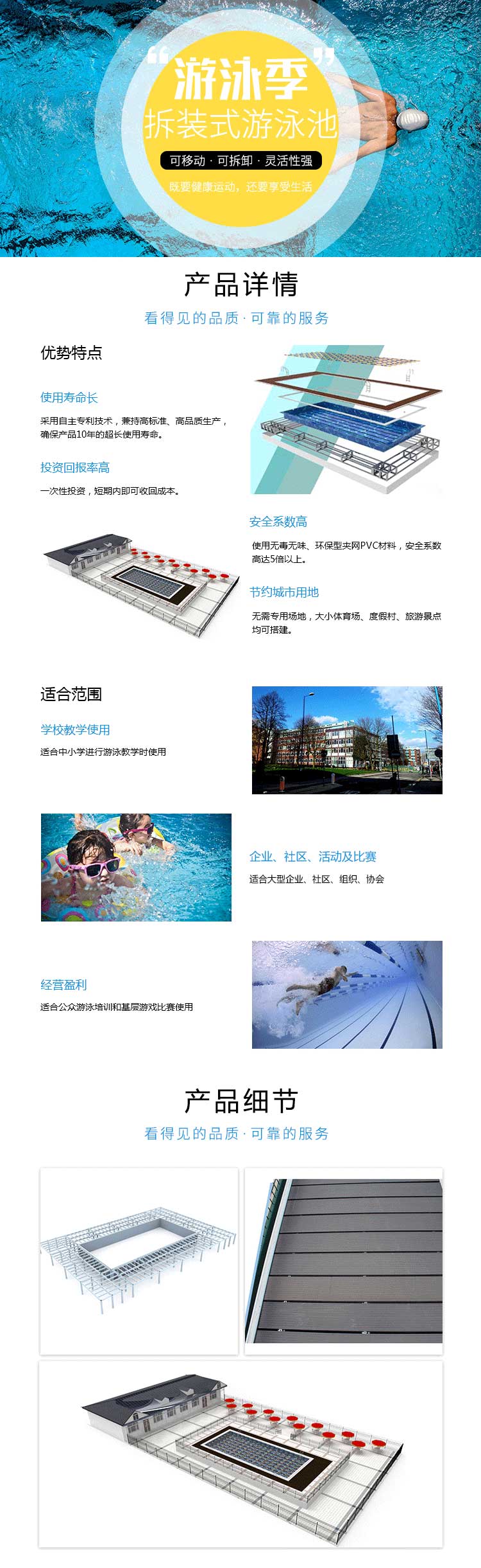 本公司對拆裝式泳池進行研發制造,至今已積累豐富經驗,掌握和攻克了大量的技術難關,現在公司產品的構造、工藝已達到了國內外先進水平。并以產品安全可靠的品質、溫馨優質的售后、全面貼心的配套服務獲得客戶的一致好評。